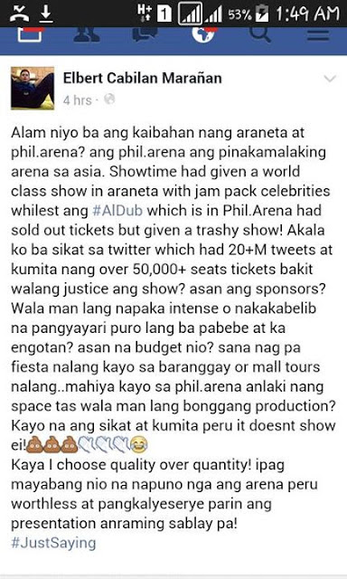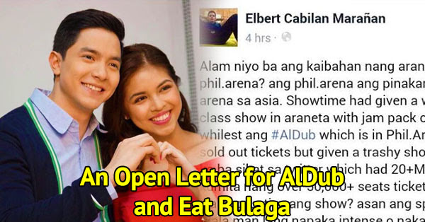 A man named Elbert Cabilan Maranan who appeared to be a fan of Showtime claims that Eat Bulaga gave a worthless show when they were able to fill the Philippine Arena for the Tamang Panahon of AlDub.